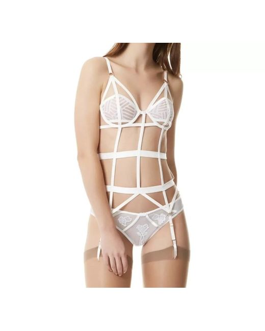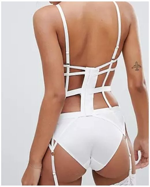 BLUEBELLA TIGERLILY BASQUE. UNDERWIRED UNPADDED LACE CUP. WHITE WITH CUT OUT CAGED DETAIL. SIZE 30D - UK 8. You can buy a quicker service from the drop down at checkout. PRODUCT CODE 1203099.