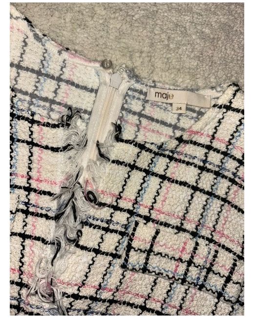 Embrace effortless elegance with this stunning Maje dress in size 34. Belt is missing The dress features a beautiful check pattern in multicoloured hues, perfect for any occasion from travel to weddings, holy communion, parties, cocktails, and even formal events. The sleeveless design with a flattering V-neckline and zip closure adds a touch of sophistication to the dress. Crafted from high-quality cotton tweed fabric, this short dress is a must-have for your wardrobe. It's easy to care for and can be dry cleaned only. This dress is perfect for petites and comes in a stylish mini length that is suitable for all seasons. The dress is made by a trusted brand, Maje, and is ideal for women who love effortless style.