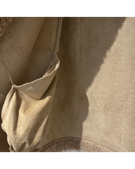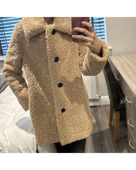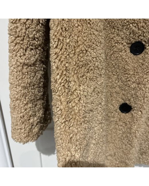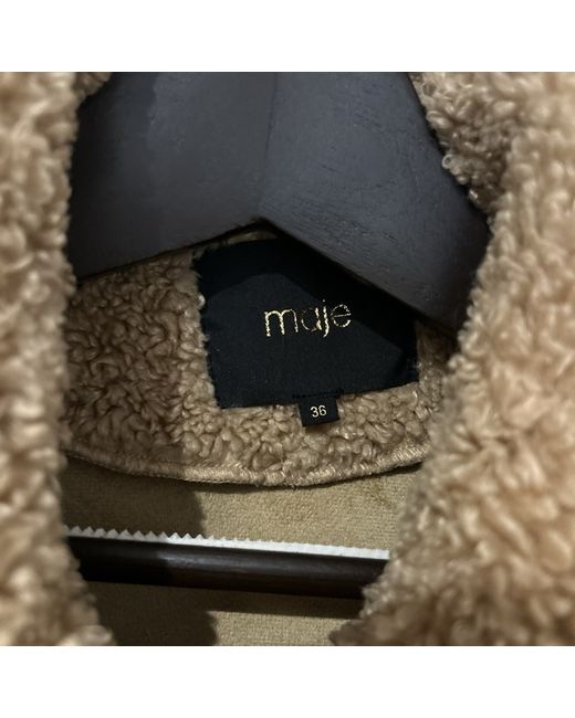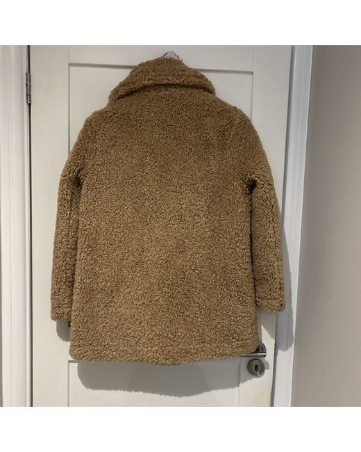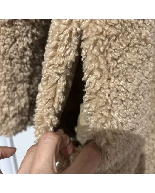 This is a Maje Teddy Coat for women in size XS. The coat is made of polyester material in a beige colour. It features a regular fit and a stylish teddy design, perfect for adding a cozy and chic touch to any outfit. Shoulder to shoulder 16.5” Length 30”