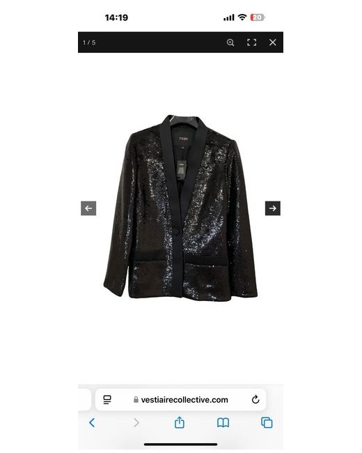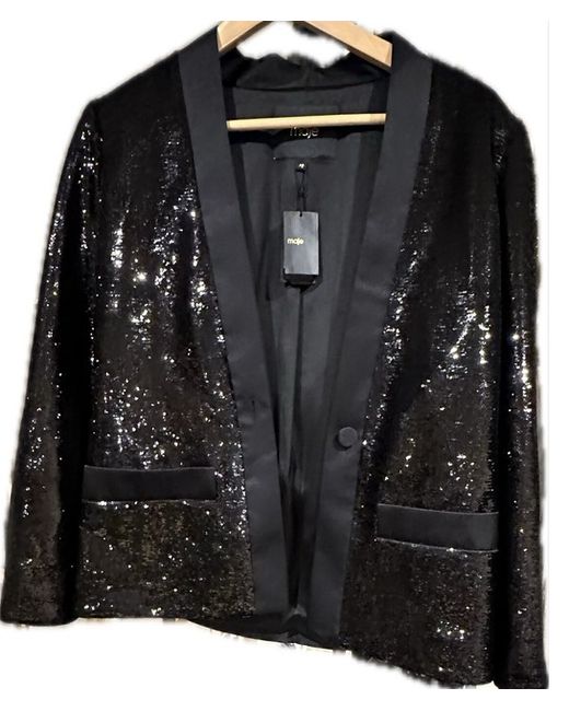 Add a touch of glamour to your evening look with this stunning black sequinned jacket from Maje. The jacket is in perfect condition - sequinned with satin lapels and a great shape - slightly fitted at the waist - looks great worn open over a t-shirt with jeans or can dress up any outfit. Elegant and timeless . Retailed at 420euros so a real bargain. .