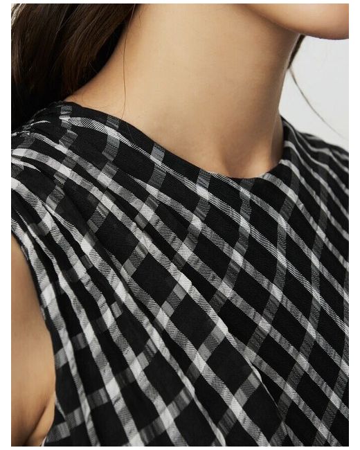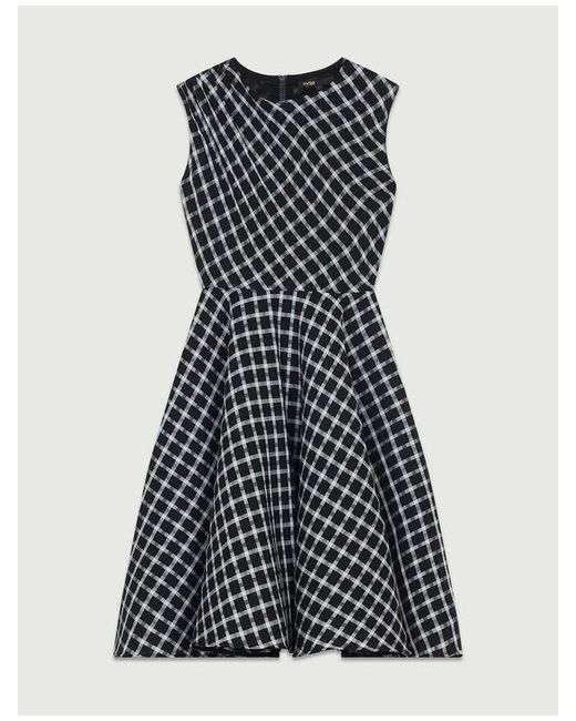 Maje SLEEVELESS PLAID SKATER DRESS. Description •Sleeveless plaid skater dress • Round collar • Ruching at shoulders • Back zip • Skirt lined in basketweave fabric to lend volume • Second lining in jersey The mannequin's measurements are 1m78 and is wearing this item in size 1 Care instructions Hand wash Do not bleach Iron at a maximum temperature of 110°C without steam Do not dry clean Do not tumble dry 63% polyester 37% viscose