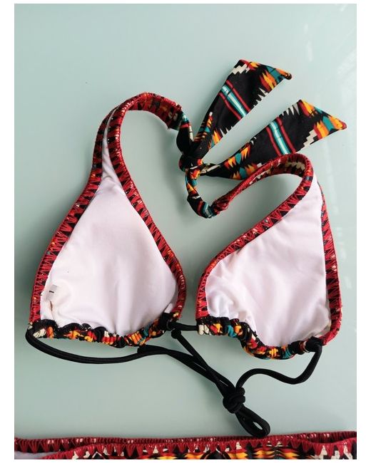 XS Beautiful Billabong Triangle Bikini Set. In red yellow green & black with red edging W/ embroidered logo on back Size 1 looks to be XS Flat unstretched measurements: 26 1/2 " / 67 cm waistband on brief 5 1/2" / 14.5 cm triangle of top