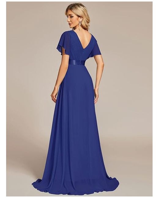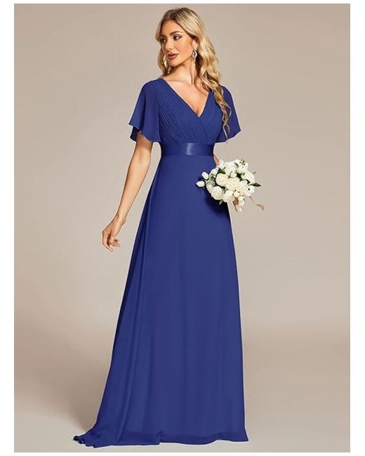 This elegant flowing chiffon bridesmaid dress features a V-neck, high waist, ruffles sleeves and a delicate hem. Features:short sleeves, V-neck, Floor-length skirt, zipper at the back. Ever-Pretty is a leader in the fashion world with over 14 years of experience and expertise, we have the ability to identify every woman's need.
