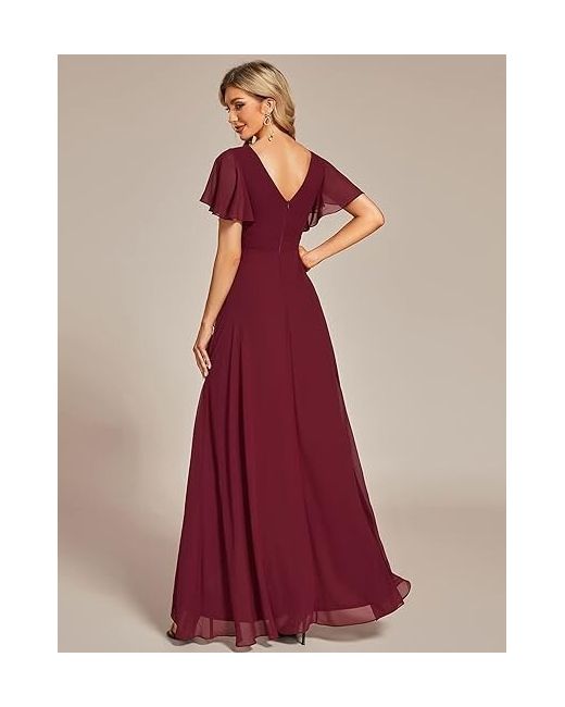 This beautiful burgundy dress from Ever Pretty is perfect for formal occasions. The dress features a flattering A-line style and a V-neckline, with short sleeves and a long, flowing chiffon skirt. The concealed zip closure adds to the elegant, sophisticated look of the dress.
