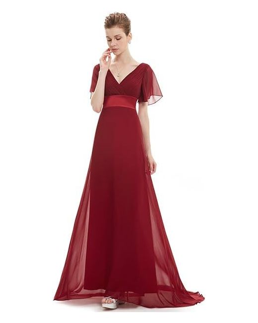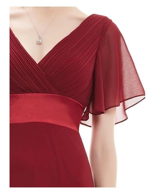 Stand out at your next formal event in this stunning burgundy A-line dress by Ever-Pretty. The dress features delicate ruffle flutter sleeves and a v-neckline, along with a high waist and empire silhouette for a flattering fit.