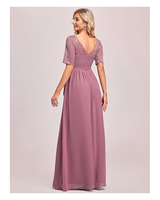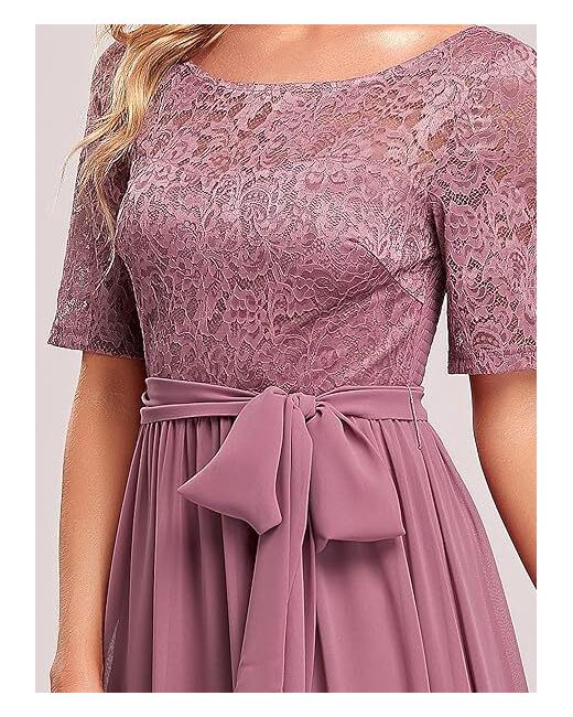 The dress features a beautiful orchid colour and is made from a combination of polyester and nylon with lace and chiffon fabric types. The A-line style dress has an empire waist and an elastic back band for a comfortable and flattering fit.