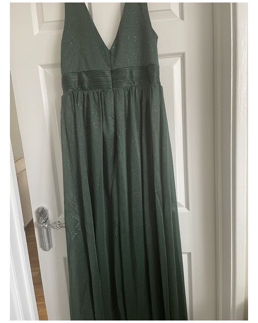 Dark green double V neck floor length sparkly evening dress.