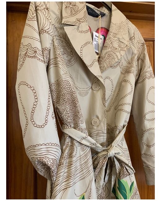 This Desigual trench coat is a stylish and versatile addition to any woman's wardrobe, featuring a floral pattern in a beige colour. With a mid-length and long sleeves, this button-up coat is perfect for casual occasions and offers a regular fit for comfort. The belted design adds a flattering touch, while the lightweight construction makes it ideal for layering in the autumn and spring months. The classic trench style, collared neckline, and button accents complete the timeless look of this must-have piece.