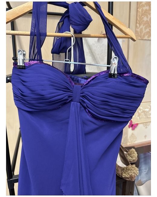 Debut size 8, 100% polyester, purple dress, halter strap, can be worn strapless, sequins, lined, zip at side, bra padding, new with tag but just the return tag (no returns), knee length