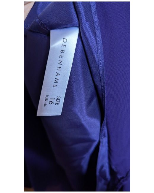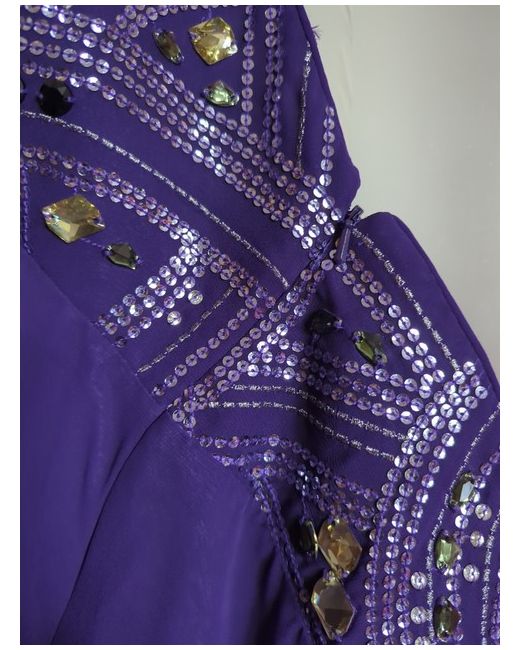 The dress in lined, with a purple under-dress and an outer chiffon layer with pointed hem. The dress fastens at the back with a zip.