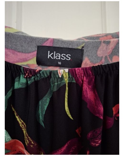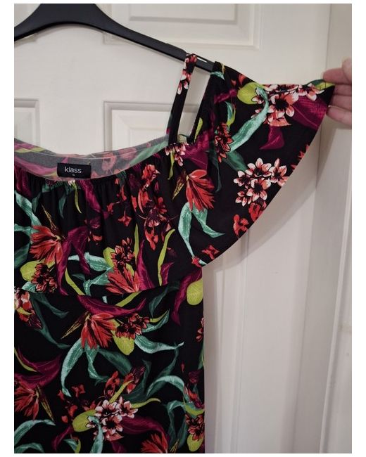 Klass dress for the summer, bardot style top with frill around bust, very pretty black/multi. Never worn but no tags