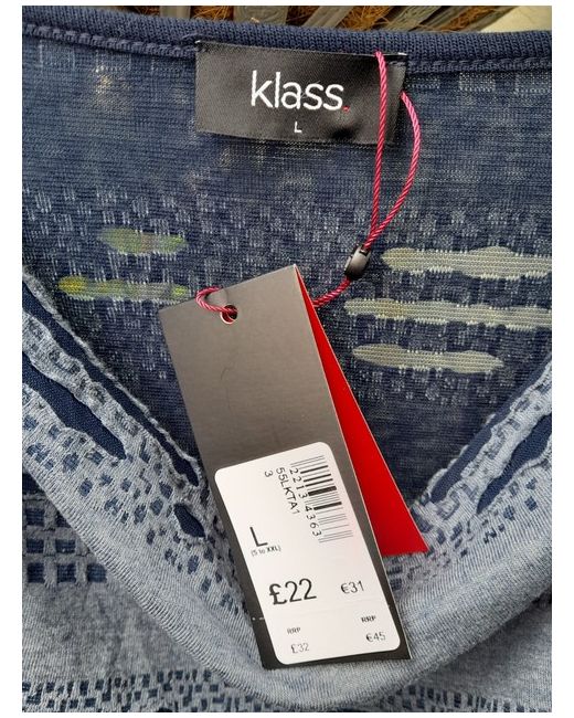 Klass Top Size ( Large.) Fine Knit Jersey. Polyester 65% Viscose 35%. Navy/Grey/Blue. Multi Pattern. Cowl neck. Stripe/Cut Out Effect Design. Three quarter sleeves. Ruched ties each side on hemline. Chest 44 inches Length from back of neck 27 inches. New with tags.