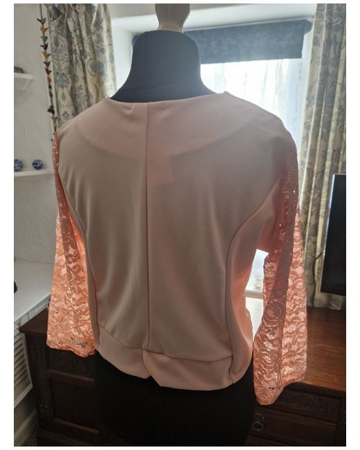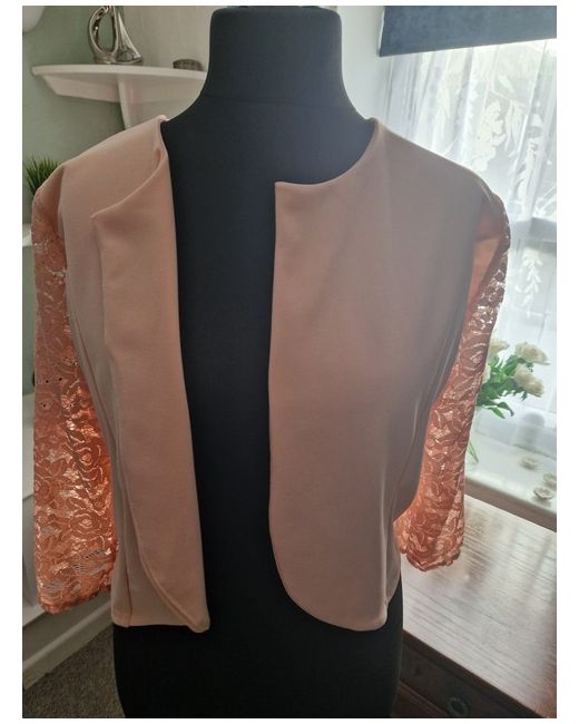 This is a very pretty lace sleeved jacket. It says pink but it's more of a peach/pink in colour. It will look fabulous with a dress or with jeans. Any questions please ask. Thank you for looking.