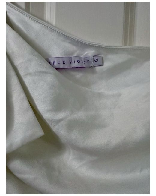 This True Violet mini dress in white is perfect for weddings or formal occasions. It features a drape shoulder neckline, sleeveless design, and a flattering ruched bodice with a bow accent. The dress has a zip closure and is made of polyester. With a size 6 fit, this dress is ideal for a bridal or wedding theme, suitable for all seasons. Smoke/Pet Free Home