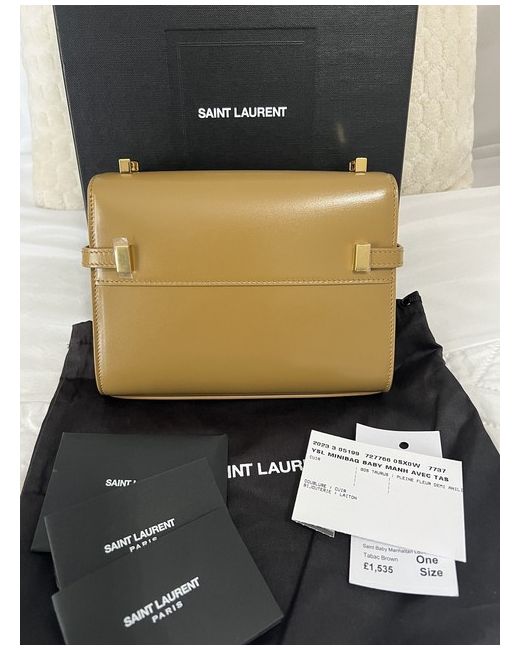 MINI BAG WITH A SMALL FLAP ON TOP AND COMPRESSION TABS ON THE SIDES, FEATURING AN ADJUSTABLE STRAP. BRONZE-TONED HARDWARE MAGNETIC CLIP BUCKLE CLOSURE ONE MAIN COMPARTMENT, ONE FLAT POCKET LEATHER LINING CALFSKIN LEATHER, BRASS Brand new YSL Mini Manhattan Bag in a beautiful caramel brown shade Comes complete with packaging and tags - all protective seals in place I’ve taken pictures in different lighting and angles to show the colour RRP £1665