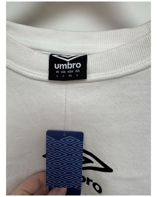 This Umbro sweatshirt is a cropped style in white with a black Umbro logo on the front. It features a logo pattern trim on the sleeves, long sleeves, and a crew neckline. Made of polyester and cotton, this regular fit sweatshirt is perfect for activewear such as football or running.