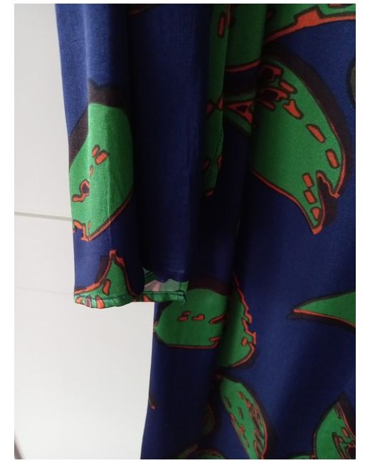 Original Ghost Dress Size L. Satin blue and green foliage pattern. Centre back zip high neck with 2 fabric covered buttons at back.