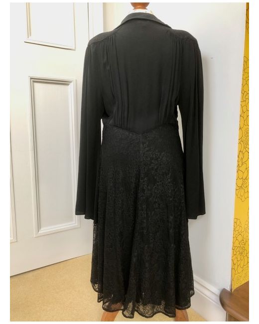 Beautiful Ghost chiffon and lace evening dress. The top and sleeves are chiffon with a pleated detail. The V neck has an embroidered collar. The sleeves are a beautiful bell shape. Shoulder pads give structure and shape.