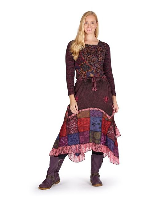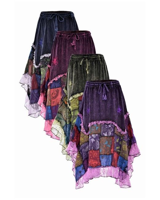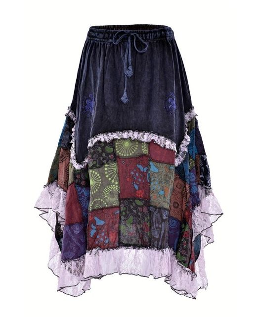 Stretchy stonewashed cotton, elasticated waist and drawstring, embroidery & patchwork design with lace detail. Also colours are not always clear on digital image.