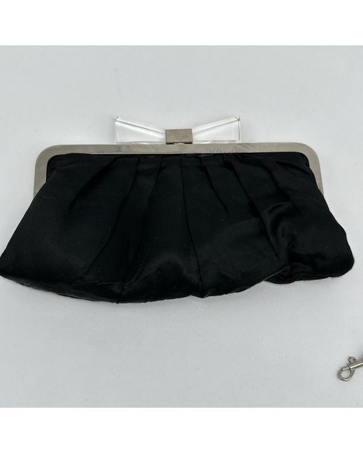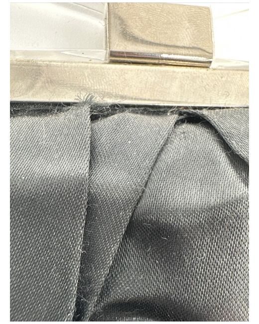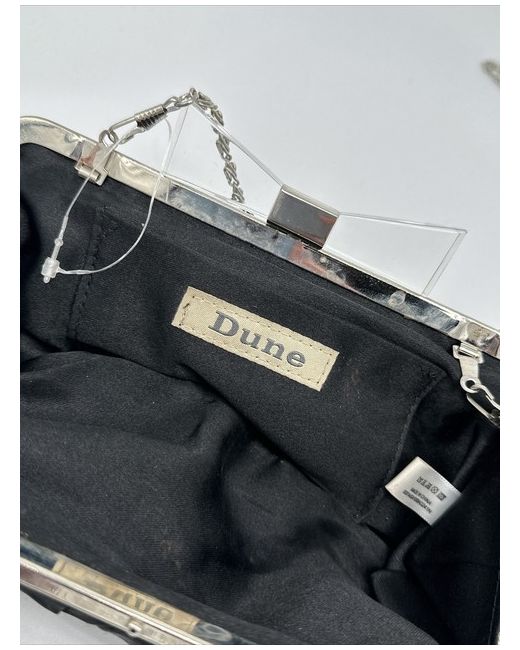 Add glamour to your outfit with this elegant Dune shoulder bag. The rectangle-shaped bag is made of clear acetate material and features a beautiful black satin lining. It has an adjustable metal strap with silver and black hardware that adds a touch of sophistication to the design. The bag has a clasp closure and measures 20 cm in width, 13 cm in height, and 5 cm in depth. The black handle/strap colour complements the shiny silver and black accents of the chain strap. The bag is perfect for formal occasions like weddings or parties and can hold your essentials comfortably. Length 8” Width 5” Slight defect fabric coming away from the clasp please see photos