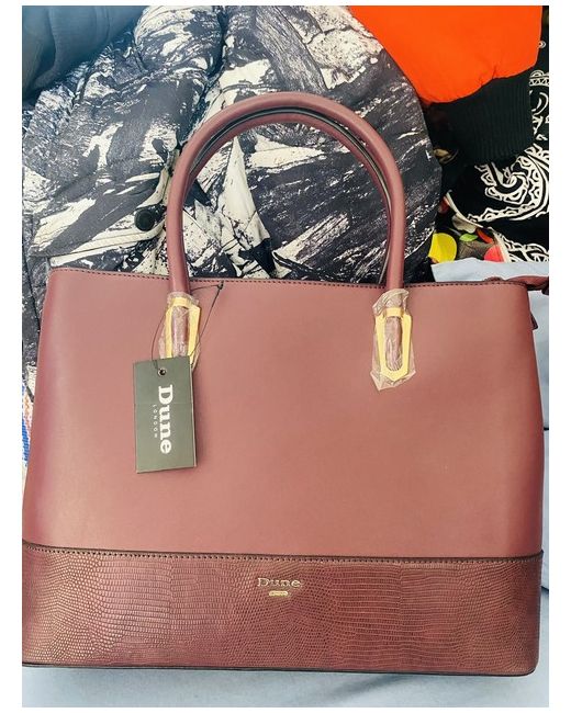 This is a brand new Dune shoulder bag for women, made of burgundy faux leather. The bag exudes a stylish and sophisticated look that is perfect for adding a pop of colour to any outfit. With the Dune brand known for its quality and design, this handbag is sure to be a versatile and chic accessory for any woman's wardrobe.