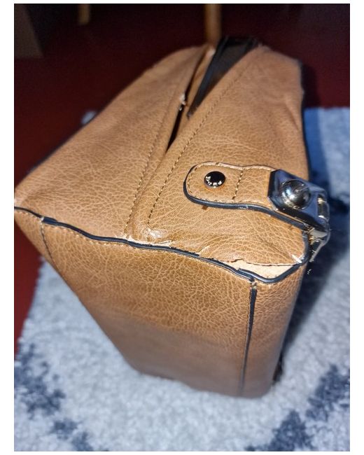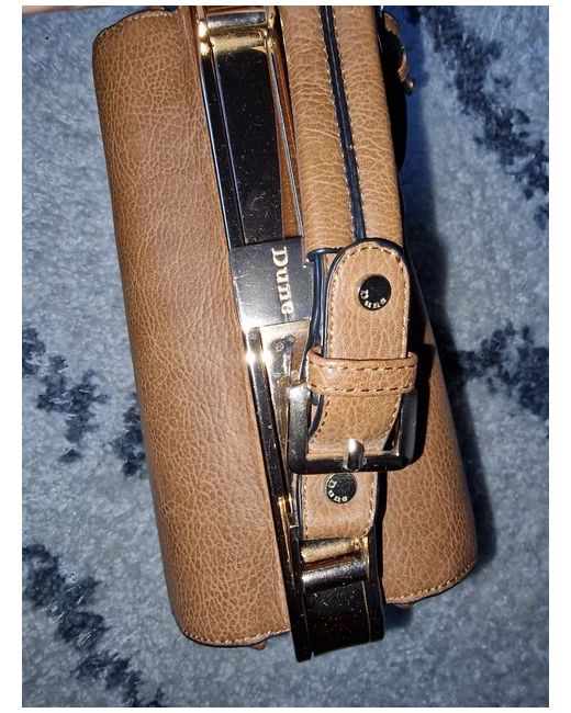 This stylish Dune satchel bag is a must-have for any fashion-forward woman. Crafted from high-quality polyurethane, this bag boasts a beautiful brown exterior with elegant gold hardware. The bag features a spacious interior lined with black nylon, making it perfect for carrying all of your essentials. With a top handle design, this bag is perfect for both casual and formal occasions. The Dune satchel bag is a statement piece that is sure to turn heads wherever you go. It had a small tear on the bottom corner as shown in one of the images which can be repaired and is not noticeable while carrying the bag.