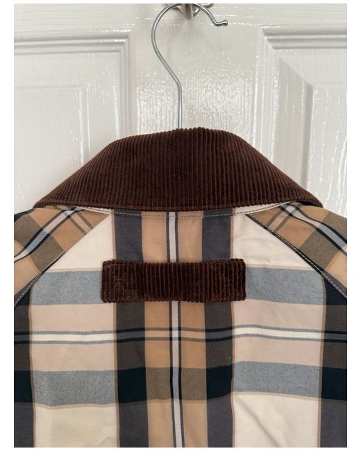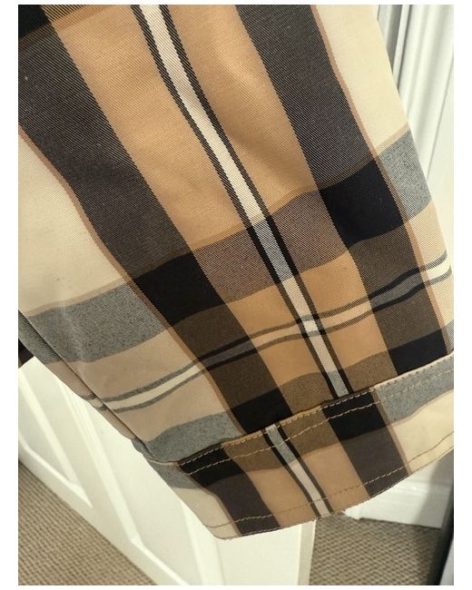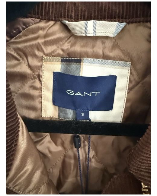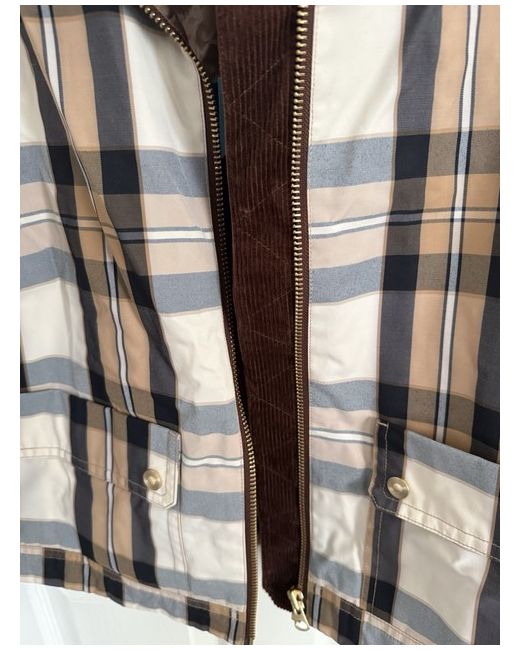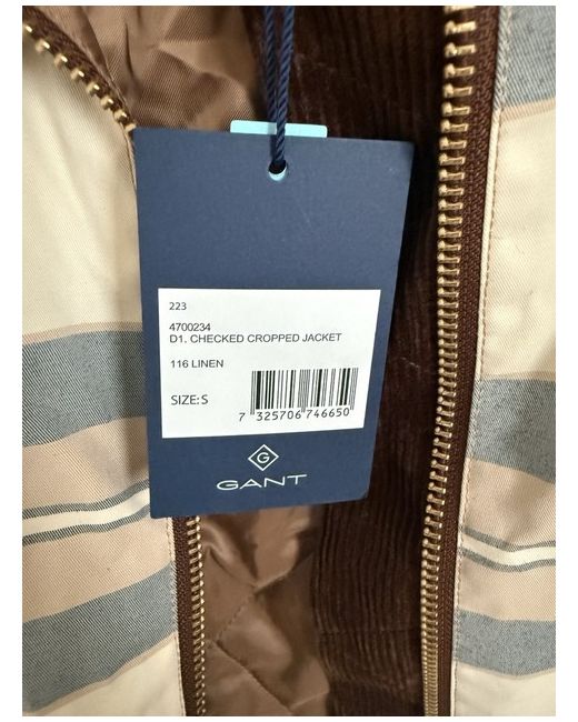 This GANT women's checked barn jacket in size small features a cropped length, long sleeves, and a relaxed fit. Made of polyester with a cotton lining, it is designed in a brown check pattern. The jacket has a collared neckline, zip closure, and pockets, making it suitable for travel, casual, formal, and workwear occasions. Lightweight and versatile, it is ideal for autumn, winter, spring, and summer wear.