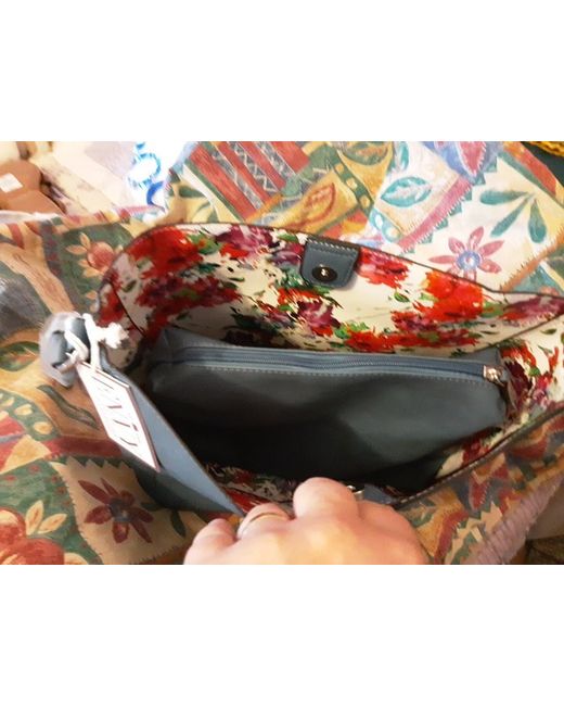 It's denim blue coloured faux leather. With floral print interior and reverse of strap. Magnetic closure to outer bag, smaller inner bag has a zip and is similarly floral patterned.