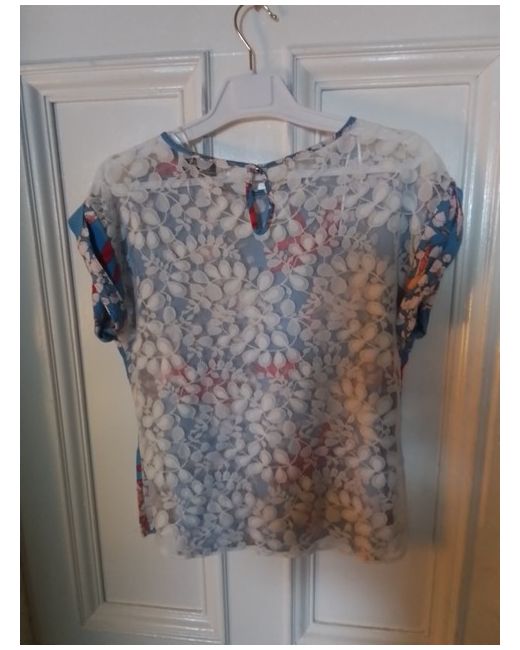 Very pretty top in floral and bird pattern by Closet, in size 12. Top has scoop neckline and has short sleeves. Top has back panel in cream lace with patterned front panel. Top fastens with small buttonon back of neckline.