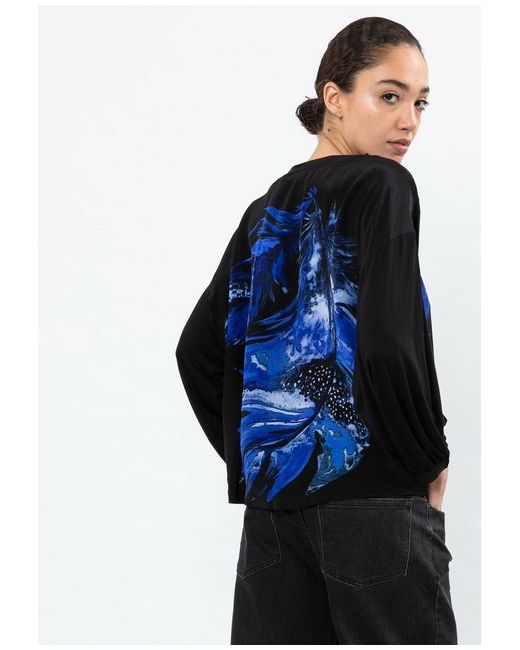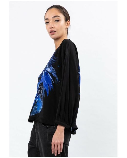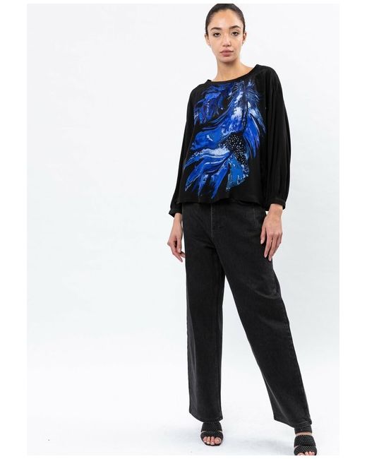 The Quartz top is the perfect desk-to-dinner style with Religion's hand-painted feather print in blue tones on a black base. This oversized top features a round neck, that can be worn off the shoulder, has batwing sleeves and is hip length.