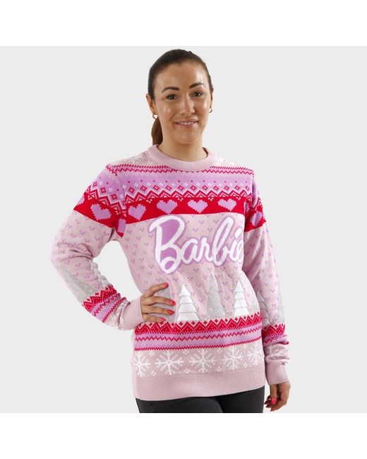 Dive into the festive season with a sprinkle of Barbie magic! Cozy up with its warm long sleeves made from 100% acrylic. Official Barbie gear for the ultimate winter wonderland fun! Festive Barbie Christmas jumper featuring a vibrant pink, red, and white pattern with a sparkly glitter tree design.