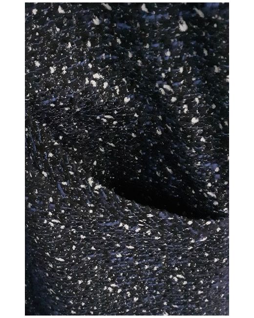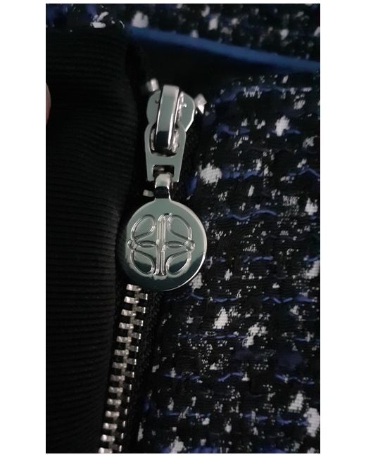 A generous fitting, collarless, tweed effect, mid-length jacket from Fenn Wright Manson. It has a full length zip fastening, jetted pockets and is fully lined. The tweed effect fabric is predominantly black with white and bright blue flecks. Measurements: Underarm to underarm: 25 inches Back length: 32 inches Overseas buyers please ask for postage cost