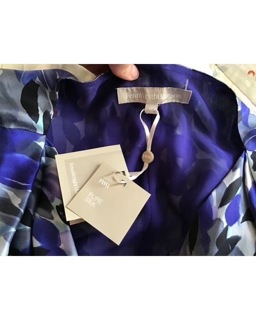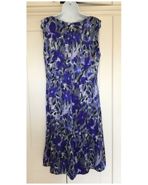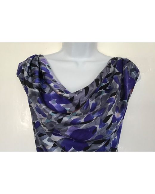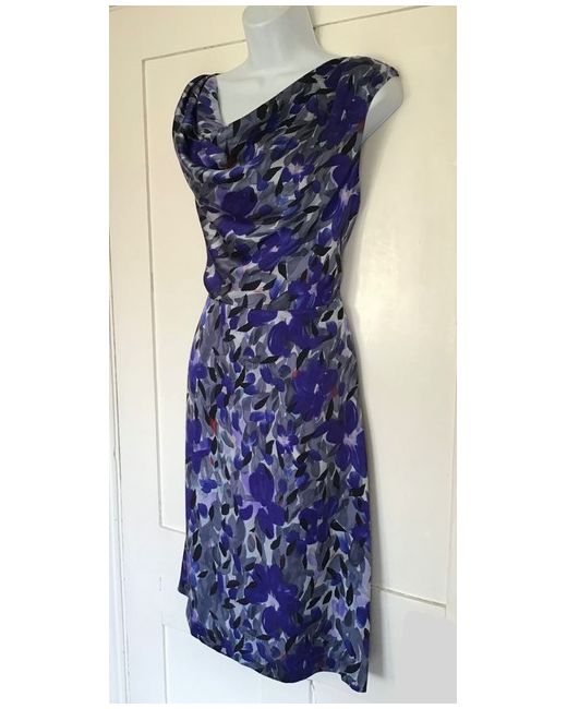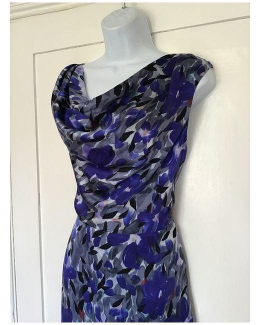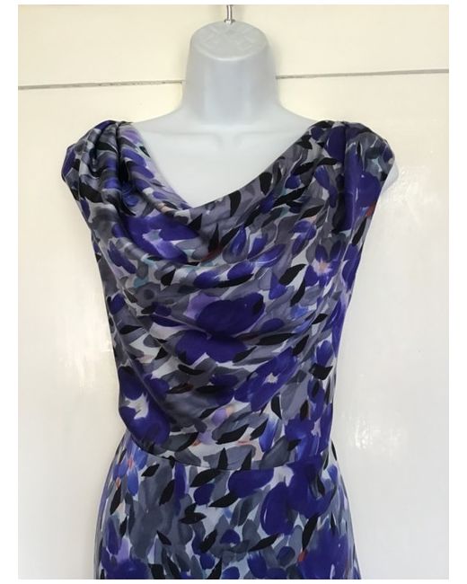 Smart silk dress from Fenn Wright Manson featuring a grey and blue abstract floral brushstroke print. The dress is sleeveless and has a cowl neck front. Perfect for smart, dressy occasions.