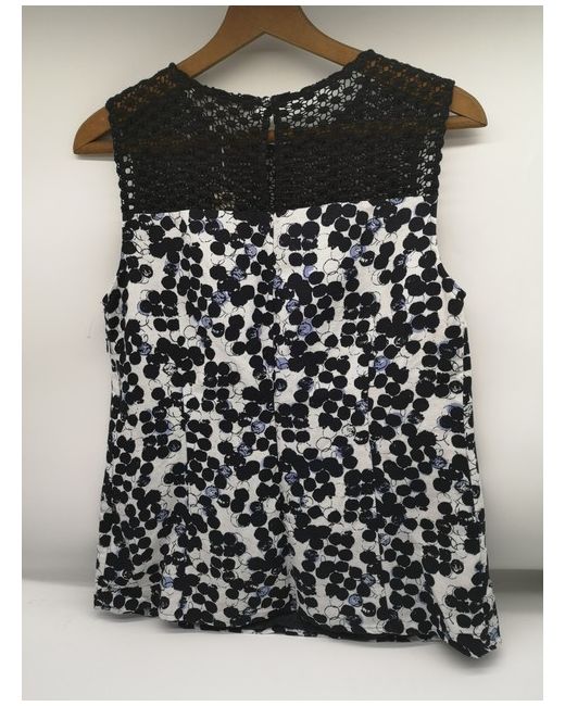 This Fenn Wright Mason sleeveless top is a versatile addition to any wardrobe. The round neckline and button & side zip closure make it suitable for both casual and business occasions. The top is fully lined and features a geometric pattern in blue, with crochet accents adding a touch of elegance. Made from a blend of linen, viscose, cotton and polyester, this top is comfortable and breathable, perfect for warmer weather. It has a regular fit and is available in size M. The top is a basic style with a regular size type, and is perfect for pairing with jeans or dress pants.
