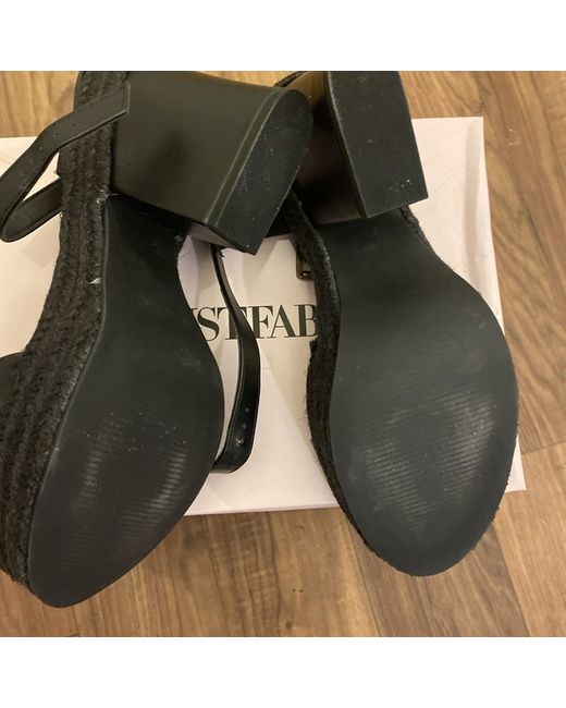 The shoes are a size 9 black JustFab espadrille heel for women. They are made of synthetic material.