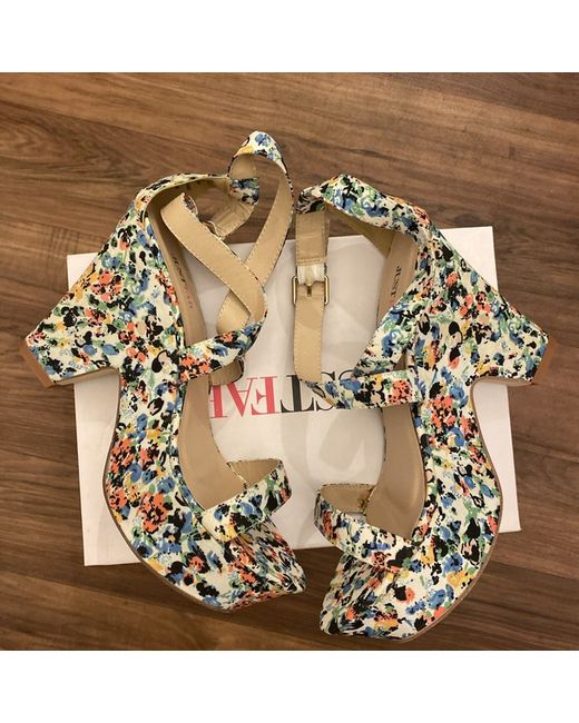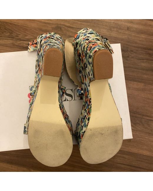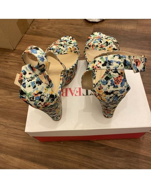 New with box, these JustFab platform heels are a UK size 9 and feature a multicoloured cotton blend upper. Perfect for adding a pop of colour to your outfit, these heels are stylish and unique.
