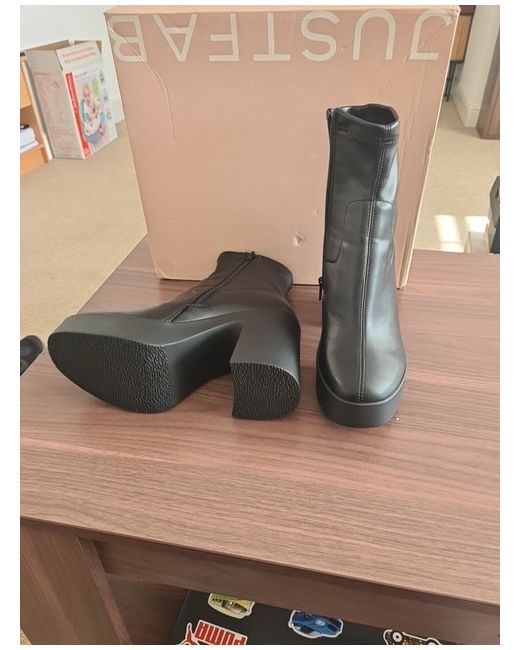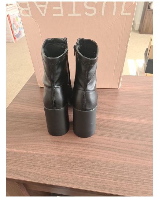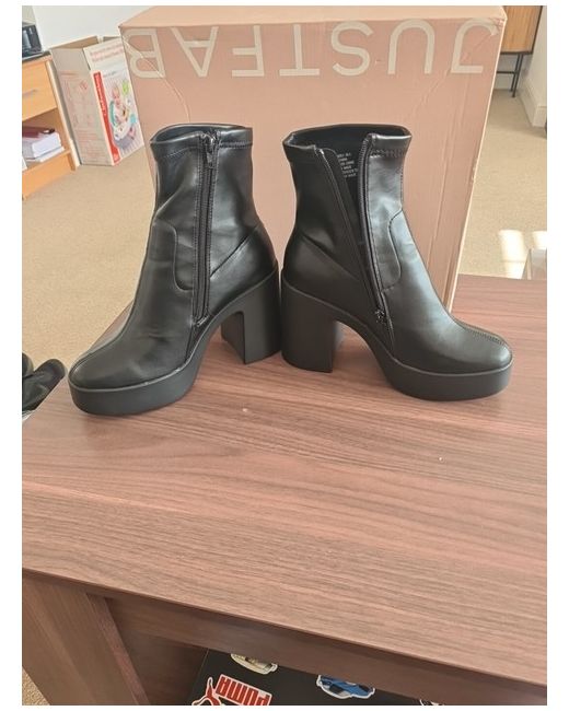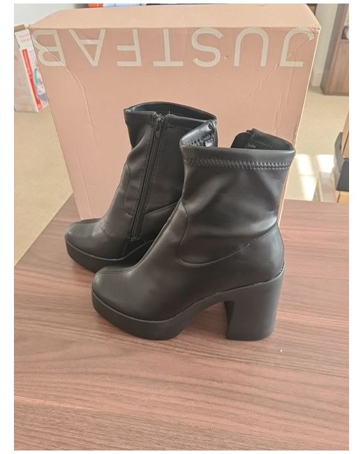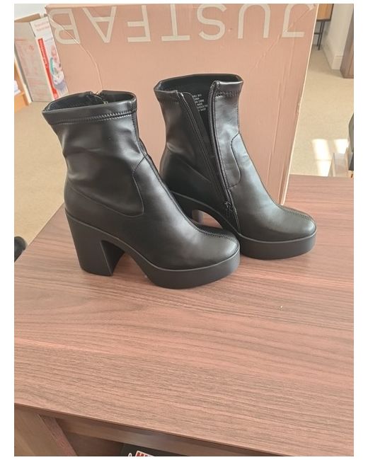 Elevate your style with these sleek black booties from JustFab. Perfect for any occasion, these boots are a must-have for any fashion-forward woman. Crafted with high-quality materials and designed with comfort in mind, these boots will keep you feeling and looking great all day long. With a UK shoe size of 6, these boots are the perfect fit for any stylish woman. The bootie style is on-trend and versatile, making it easy to pair with any outfit. Whether you're heading to work or out for a night on the town, these boots will keep you looking and feeling your best.