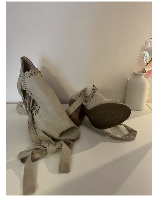 Just Fab open toe Beige suede look boot with 4” heel.