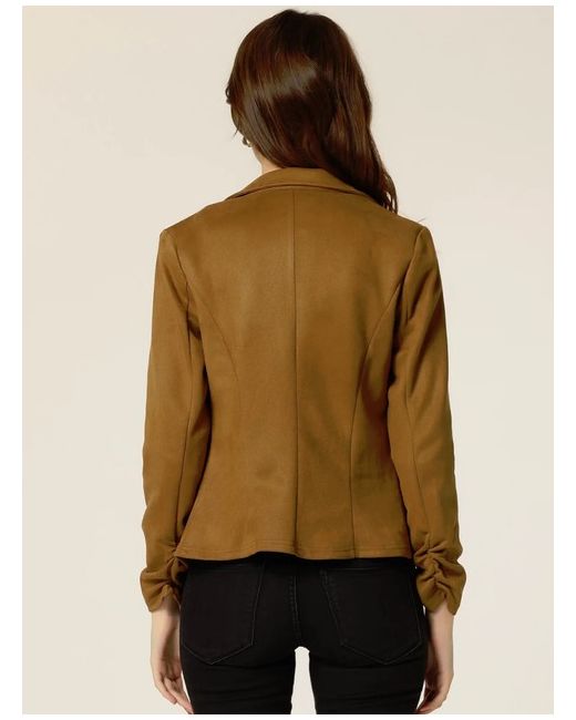 Faux suede blazer, patch pockets, long drawstring sleeves, button up, notched lapel, mid-length. Functional patch pockets give this faux suede blazer a more casual look. The drawstring design on the cuffs allows you to turn the long sleeves into 3/4 sleeves.