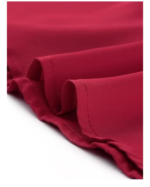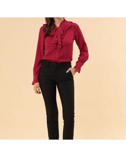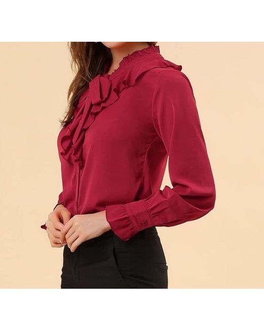This women's blouse by Allegra K features a high neck with a ruffle detail, tie neck, and ruffle cuffs. The button front closure adds a touch of elegance to this solid red shirt, suitable for various occasions including travel, weddings, parties, workwear, and more. Made of polyester, this long sleeve blouse with flutter sleeves is machine washable and designed for a regular fit in size small. Perfect for all seasons, this classic style work shirt is a versatile addition to any wardrobe.