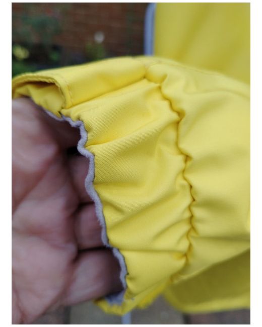 Colour is best illustrated by picture 3 (bright yellow outer) and picture 4 (navy blue lining).