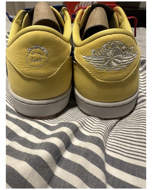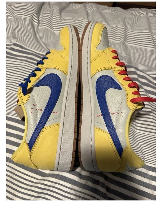Uk11 Brand New in Box Comes with Yellow / Blue / Red laces Elevate your sneaker game with the Nike Air Jordan 1 Low X Travis Scott in Canary Yellow. This stylish trainer, designed for men, features a sleek and modern silhouette that will surely turn heads. The shoe is made with high-quality materials and boasts a comfortable fit, making it perfect for everyday wear. The Air Jordan 1 Low X Travis Scott is a must-have for any sneaker enthusiast. With its bold yellow colour and iconic design, this trainer is sure to make a statement. Whether you're hitting the streets or simply running errands, these sneakers will keep you looking stylish and feeling comfortable all day long.
