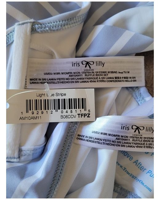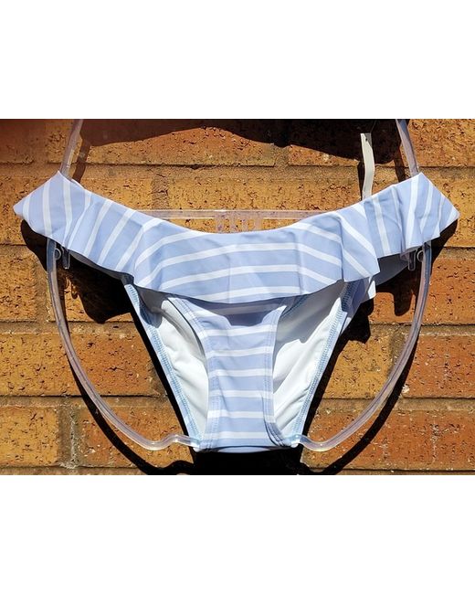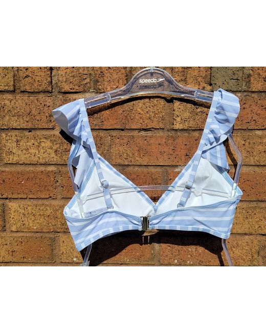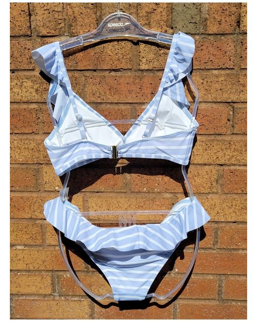 Iris And Lilly Padded Ruffle Bikini Set In Light Blue Stripe Size Medium UK 14. Flattering bikini set by Iris And Lilly. Bottoms come with Elasticated waistband with ruffled overlay to front and back Matching bikini top with adjustable shoulder straps and Gold coloured clasp to rear. Ruffles to shoulder and bust. Light padded but can be easily removed 80% Nylon 20% Elastane Machine washable
