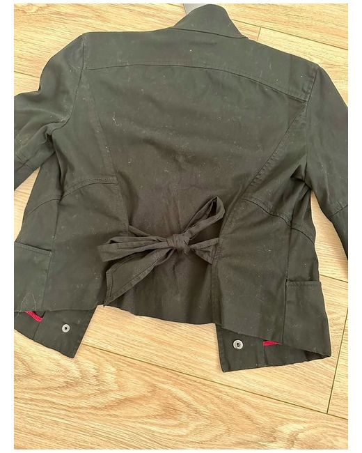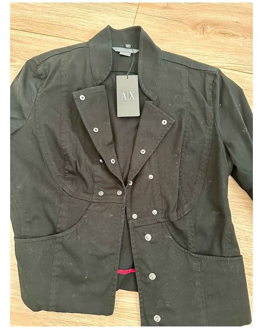 Elevate your style with this stunning black jacket from Armani Exchange. Crafted from a cotton blend, this mid-length jacket features a slim fit and 3/4 length sleeves with bell sleeves from the elbow. The snap closure and pockets add practicality to the stylish design. Tie Back straps at back can be adjusted to fit. Perfect for any occasion, this jacket is a must-have for any wardrobe. The jacket is available in size M and comes with tags attached. Add this basic jacket to your collection today and experience the timeless appeal of a classic piece.