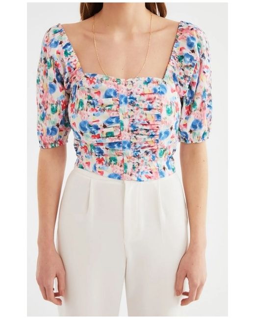 Elevate your wardrobe with this trendy and stylish blouse from Trendyol. The multicoloured crop top features a beautiful floral pattern that adds a touch of femininity to the design. The blouse is made from high-quality woven fabric that gathers around the waist, giving it a flattering and comfortable fit. Perfect for any occasion, this short-sleeved blouse is a must-have addition to your wardrobe. The size UK 6 (XS) is suitable for regular size types and is sure to fit comfortably. This blouse is perfect for pairing with high-waisted jeans or skirts, creating a chic and fashionable look. Brand New. Item nr 507/21(064)