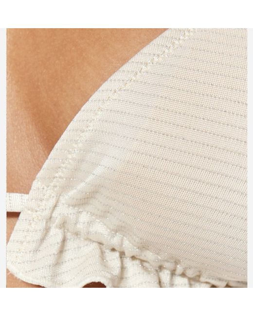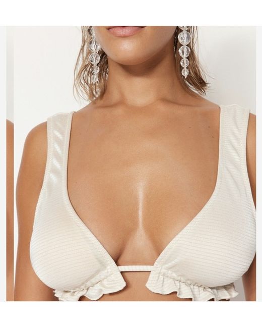 TRENDYOL SOLID RUFFLE HEM BIKINI TOP Size 12UK Make a splash at the beach in this trendy ecru bikini top by Trendyol. The ruffle hem adds a flirty touch while the adjustable straps ensure the perfect fit. Made with a blend of polyester and elastane, this top is comfortable and durable for all-day wear. This bikini top is perfect for any beach or pool day, and its size 12UK ensures a great fit for any woman. The solid colour and stylish accents make it a versatile addition to any swimwear collection.