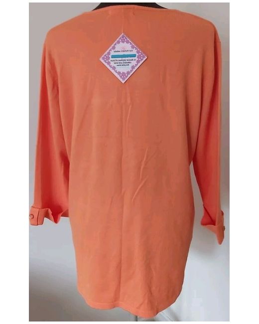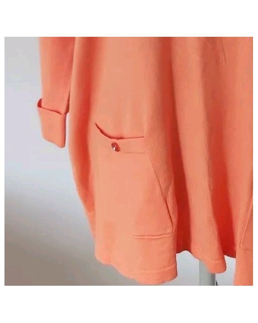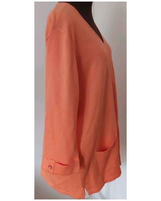 A beautifully soft V neck jumper from Michelle Hope in a flattering orange hue 3/4 sleeves with folded back cuffs and button detail 2 patch packets with same button detailing as the cuffs 5cm side split at hem Garment length: 66cm Underarm to underarm: 56cm Machine washable