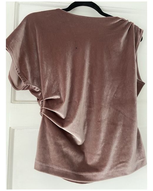 With asymmetric sleeves, velvet detail top is sure to turn heads. Sleeveless to the left and short-sleeved to the right, it's collected beneath the sleeve to offer plenty of stylish drape. Not worn but has a small fit in the front , not sure what it is