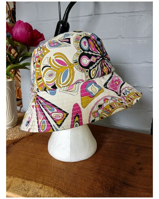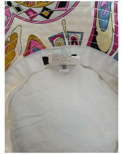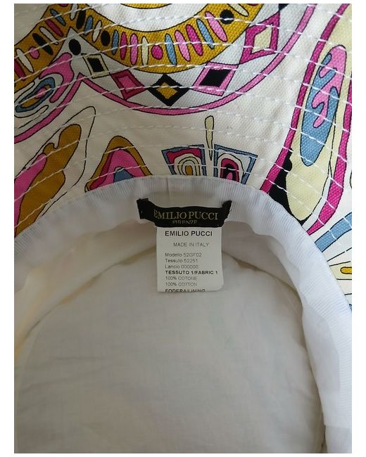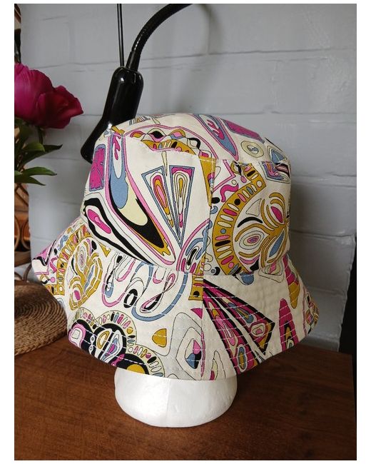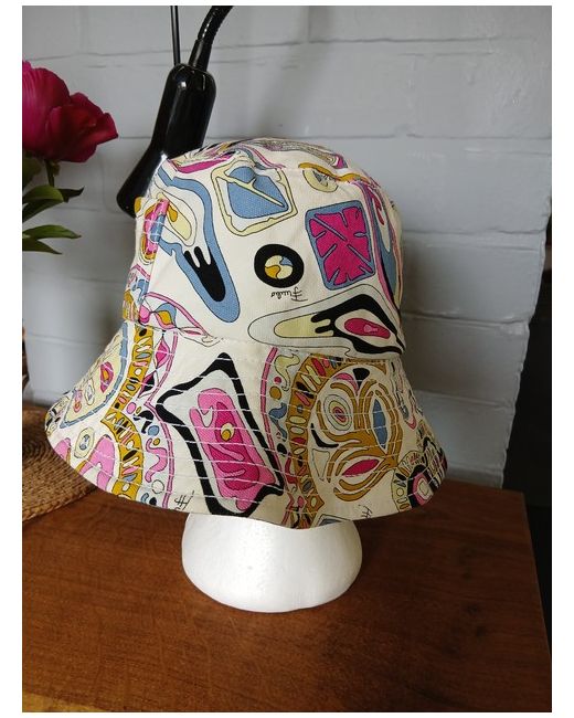 Emilio Pucci Bucket Hat. Multi coloured : pinks/blues/ mustard/ lemon & black on creamy white background. With signature logo amidst patterning.