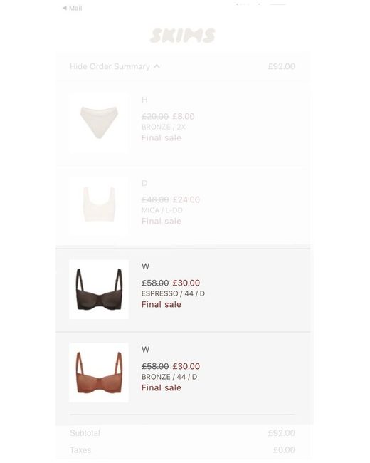 SKIMS Unlined Balconette Bra size 44D colour Espresso. Absolutely stunning colour and nice, light, soft touch fabric. Unfortunately is way too big for me and can't be returned as it was part of the final sale.